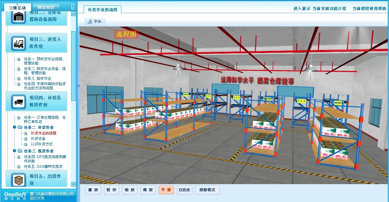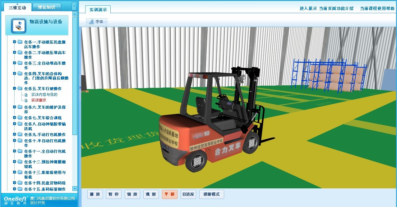 凤凰创壹虚拟物流服务与管理教学平台是一套面向物流行业相关重要环节的3D动画仿真教学软件,它涵盖了《物流基础》、《仓储与配送实务》、《运输实务》、《物流设施与设备》、《国际货运代理实务》、《仓储与配送实训》等实用课程。平台是基于虚拟现实技术而开发的物流服务与管理的仿真教学软件,具有数据量小、速度快、精度高、互动性强的技术特点。软件采用视窗操作、功能模块直接拖拽使用、对使用者没有太高的计算机能力要求。对于在高校从事于物流专业的师生来说,凤凰创壹虚拟物流教学平台也是一套寓教于乐的、通俗易上手的、且能将物流理论与具体模型实例相结合的综合性辅助工具。平台具有以下优势: